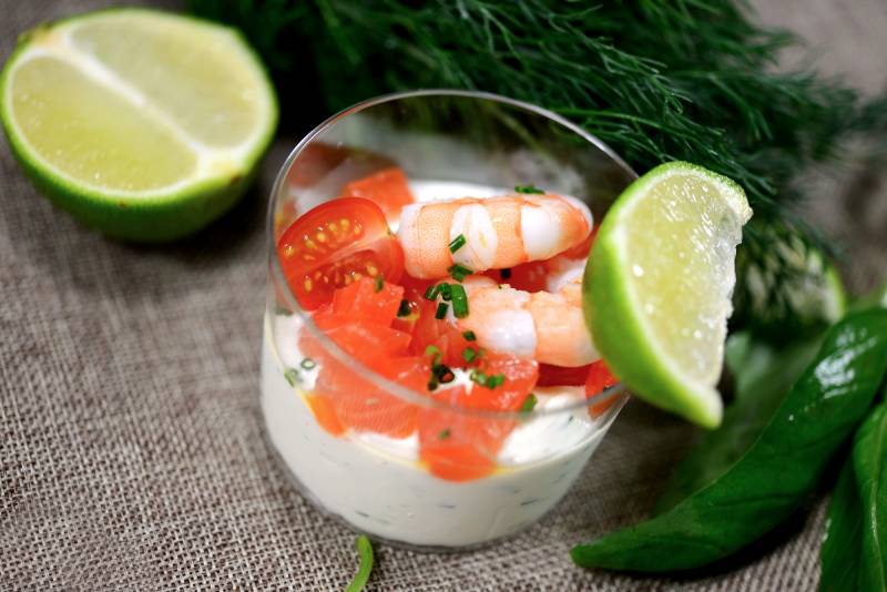 - Verrine "Cervelle des Canuts" : saumon Gravelax, crevette, fromage blanc au Chablis, échalotes et ciboulette.