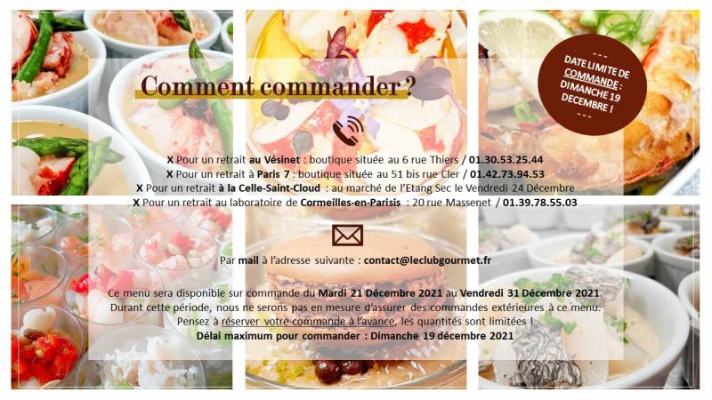 Découvrez ou redécouvrez les incontournables du Club Gourmet pour les fêtes de fin d'année : le navarin de homard aux morilles, les suprêmes de Chapon et écrasé de pommes de terre à la truffe, les tagliatelles aux St Jacques, les cassolettes de homard et St Jacques fondue de poireaux, les feuilletés aux fruits de mer, le Coulibiac de saumon Ecossais... Notre carte des fêtes vous offre la possibilité de créer votre menu de Noël de l'apéritif jusqu'au dessert : nous avons également la possibilité d'adapter les recettes en version végétarienne sur demande et à l'avance. N'hésitez pas à nous contacter le plus tôt possible afin que nos cuisiniers puissent s'approvisionner.